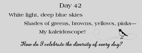 On today, May 1, the 42nd day of Spring, I am thinking about differences. In nature, diversity provides texture and interest. AND it provides the energy for change. Difference in levels causes water to flow downhill. Hot air rises as it cools. Winds blow in to fill a vacuum. Increasing presence of light fuels photosynthesis, while decreasing light damps the process. A healthy body works and rests, hearts surge and relax, lungs breathe in healthy air and breathe out poison gases. We wake, and we sleep. We grow new cells, even as the old ones die and are sloughed off. Illness happens when any of these kinds of processes stop or slow down. In nature, life is not possible without difference. Difference is a cause for celebration and hope!